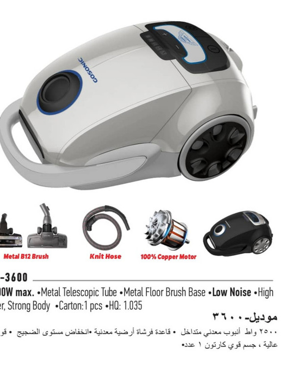 جاروبرقی گوسونیک مدل 3600_GSV یک جاروبرقی کیسهدار با توان 2500 وات و قدرت مکش 420 وات است. این جاروبرقی دارای فیلتر HEPA برای تصفیه هوا است و ظرفیت کیسهاش 5 لیتر است. طول سیم آن 6 متر و شعاع عملکردی آن 8 متر است.