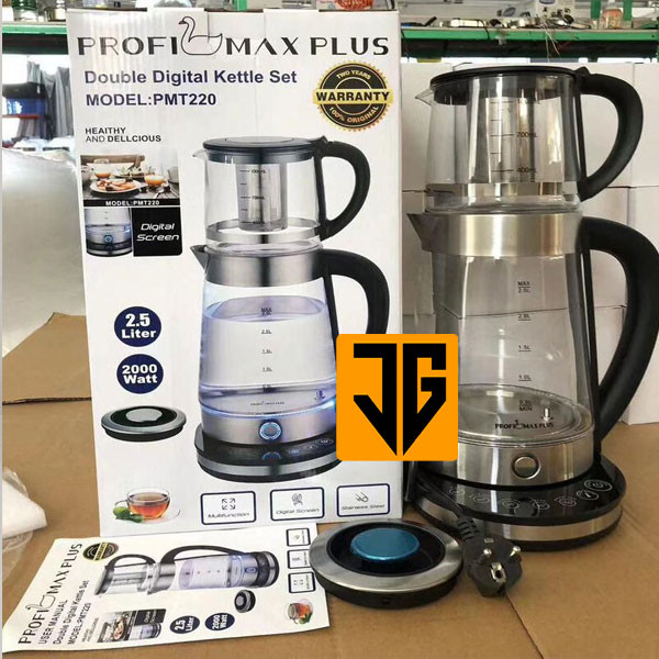 چای ساز روهمی لمسی برند پروفی مکس پلاس صفحه دیجیتال توان مصرفی 2000 وات ظرفیت کتری 2.5 لیتر ظرفیت قوری 1 لیتر دارای ترموستات جهت خاموش شدن خودکار کیفیت فوق العاده عالی ، طراحی زیبا دارای نگه دارنده دما
