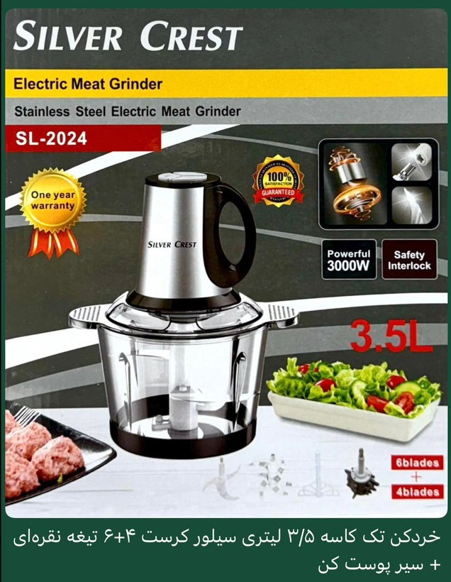 خردکن سیلور کرست مدل SL-2024 با ظرفیت ۳.۵ لیتر و موتور قدرتمند ۳۰۰۰ وات. مجهز به تیغههای تیتانیوم نقرهای، سه سرعت قابل تنظیم و طراحی مدرن. مناسب خرد کردن گوشت، سبزیجات و یخ با کارایی بالا و دوام طولانی.