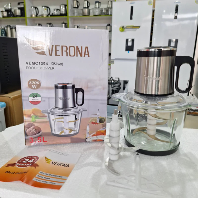 ✅برند: ورونا✅ گنجایش کاسه: 3.5لیتر✅توان: 1200وات واقعی✅دارای موتور مسی قدرتمند و گیربکسی✅درجه سرعت:3دنده✅جنس کاسه: شیشه پیرکس بسیار محکم ✅جنس تیغه: استیل ضد زنگ✅دارای تیغه 6پره پرسی طلایی اصلی✅دارای تیغه 6پره پرسی نقره ای زاپاس✅دارای همزن✅دارای شفت فلزی تیغه✅دارای چرخ دنده فلزی✅نحوه عملکرد: دکمه فشاری✅مجهز به پایه ضد لغزش✅قابلیت خرد کردن گوشت _ مرغ _سبزیجات_ گوجهفرنگی و...