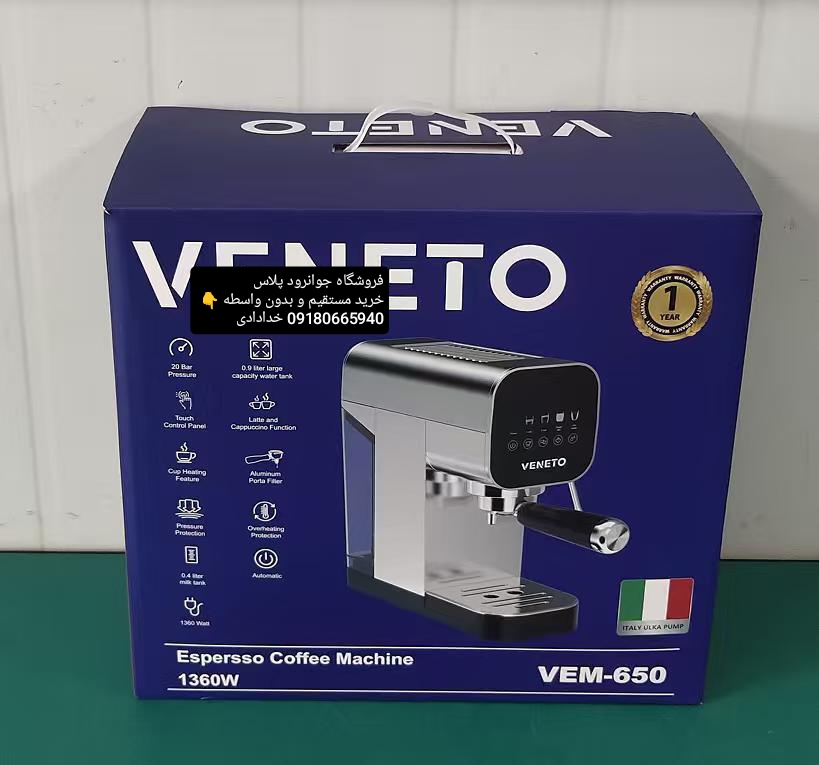 اسپرسو ساز وینتو مدل VEM_650 فشار پمپ 20 بار توان دستگاه 1360 وات پمپ ایتالیایی حجم مخزن آب 0.9 لیتر ساخت چین تحت لیسانس ایتالیا ۱ سال گارانتی تعمیر ۲ سال خدمات پس از فروش